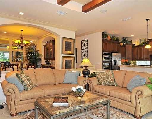 Don't miss this wonderful opportunity to reside in one of the newest neighborhoods of Lakewood Ranch Country Club East, Valderrama. Former Lee Wetherington model, Sarezzo, occupied only since November 2010, this exceptional home features the finest features and flowing floor plan throughout 3,293 sq. ft. Open and spacious taking full advantage of the spectacular views of the 12th fairway of the newest course, Royal Lakes, the homes provides luxurious yet comfortable living. The great room, a comfortable, relaxing room pairs with the wonderful Chef's kitchen, finely crafted wood cabinets, silestone counters, 5 burner gas range and ample workspace. Two comfortable bedrooms to accommodate your guests are separate from the beautiful master suite. Exquisite details with built in bookcase, finest wallpaper and large flat screen TV flank the office, den or library. Custom design window treatments enhance the beauty and only add all the fine features we have come to love in model homes. Upstairs, a bonus room complete with pool table, refrigerator, bar sink and two flat screen TV's which can easily be converted into a 4th bedroom. Relax poolside and entertain a large gathering or the intimacy of a few while cooking in the outdoor summer kitchen under roof with ample seating. This home is in perfect condition and could be available for immediate occupancy. The fabulous Furnishings are sold separate, at a reduced price. There is a few small list of personal exclusions.