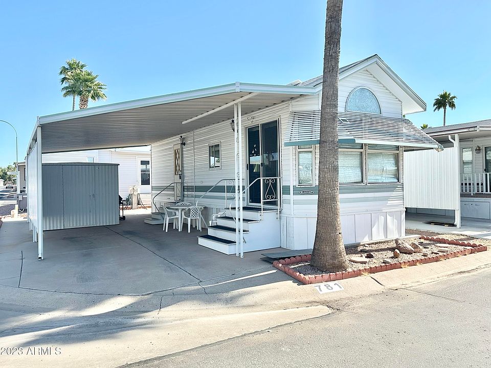 Come take a look at this 1994 Silvercrest, perfectly situated on a CORNER lot allowing for an OPEN SPACE feeling! SOUTH facing & just a short walk to our IMMENSE RECREATION CENTER! LARGE brick back PATIO great for soaking in the AZ sunshine! NICE CARPORT PRIVACY SCREEN great for shade & offering privacy! 1 Bed, 1 Bath approx 400sq ft! LARGE WINDOWS ALLOWS FOR LOTS OF NATURAL light! LOADS OF QUALITY CABINETRY ideal for all your storage needs! GREAT floor plan w/ INVITING BEDROOM W/ QUEEN SIZE BED, EXPANSIVE MIRRORED CLOSET & GREAT DRAWER SPACE! Functional bathroom w/ TUB/SHOWER COMBO & Sliding doors makes for easy use! Charming & a great LAYOUT! FANTASTIC kitchen COUNTER SPACE perfect for whipping up all your favorites! Plenty of room for all your cooking storage needs! Dining nook adjacent to kitchen, Cozy front living area w/ slider door for easy access. BRAND NEW COUCH & fully furnished. Just bring your bags! NICE SIZE SHED W/ SHELVING provides additional storage for you! COME enjoy this 55+RESORT WHERE YOU OWN THE LAND...OWN THE FUN.
