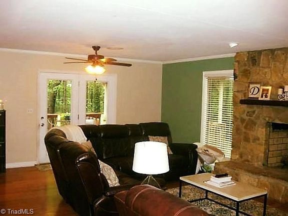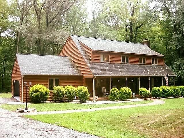 Country Living at its finest. Beautiful log sided home on 1.24 ac of private wooded land. 2 wired outbuildings, 1 is Bunce Bldg w/concrete floor & perfect for Man Cave. Lrg deck w/cover on back. Hardwood floors thru most of home. A Must See! Too many features to list.