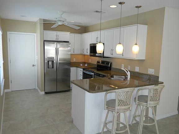 Steps to the beach with a 4/2 pool hom. This home is located in the very desirable North Shore community. Fresh total update just completed and is move in ready. This home features tile and laminate floors thorough out, 2 year old kitchen and bath countertops,ceiling fans throughout, New roof and water heater, 2 complete laundry rooms with wash tub and machines, walk in master closet, 2 fireplaces, outside shower, and cathedral ceilings in huge master suite. Security system installed. This could be a strong renter.