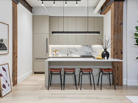 Gotham Vintage Lofts. A rare and much sought after post & beam, exposed brick loft situated in the heart of King West. Formerly constructed between 1903 and 1910 to serve as a horse harness factory and later as a textile mill. After many decades of commercial activity, this 6 storey building was repurposed & reimagined in 1997 by Paul Anisman into 54 stylish vintage lofts. Recently, the apartment was completely renovated & upgraded to please the most discerning buyer. The apartment showcases 1052 sf of interior space & a rare 54 sf balcony on the 2nd floor overlooking the beautifully landscaped garden courtyard of Minto 775 complete with a fireplace & water feature. This beautiful bespoke loft showcases 2 levels, 11'10" ceilings on the main floor, a custom white metal open riser staircase leading to the second floor, 10'2" wood ceilings on the 2nd floor, white oak plank floors throughout, exposed brick, spiral ductwork, large windows, a walk-in front closet complete with stacked washer/dryer, upgraded lighting throughout. The numerous bespoke finishings continue to showcase a custom kitchen boasting premium integrated appliances, quartz counter & backsplash, centre island & a breakfast bar. The stylish contemporary baths showcase large format tile, custom vanities, upgraded light & plumbing fixtures, the ensuite boasts a large W/I shower, frameless glass enclosure, rain shower, handheld water wand, concealed indirect lighting & a walk-in closet featuring built-ins. No stone was left unturned, new furnace & AC unit. The building features a handsome lobby, 2 elevators, a gym, meeting rooms & visitor parking. The nearby neighborhood amenities are endless; TTC 504 & 511 street cars, future Ontario Line subway stop at King & Bathurst, Fort York, Coronation Park, the waterfront trail, Stanley Park complete with outdoor pool, recreation field & off leash dog park, shops, restaurants & cafes of King West, Queen West & Liberty Village. 1 parking & 1 locker.