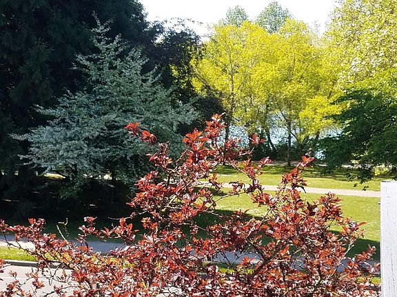 (Viewing available by appointment with face masks only) Amazing 2BR/1BA apartment literally across the street from Green Lake on the 2nd floor of a small, well-kept 4-unit building( a penthouse!). 1225 SF interior living space + 450 SF private patio facing the lake. Private entrance, corner lot @ E Green Lake Drive N. The unit is newly renovated with new kitchen/appliances, new bathroom, new floor, new skylights, an 8 foot bar counter, and 180 degree views of Green Lake. Amazing Seattle location perfect for working from home without feeling quarantined - your front door is steps to the iconic Green Lake, which has a 2.8-mile walking/running loop that is open for exercise. There is a swimming area and picnic sites near the building. Your down stair's neighborhood is a very cute coffee shop, Chacolati, that is open everyday. Walk, or take the #45 bus across the street take you to the Roosevelt light rail station in 10 minutes. In-unit laundry. One free designated parking spot on site. Requirements: -Min 3x income, 700+ credit -Need references -No eviction history, please -Guarantors will be considered -No pets, please -No smoking in the unit, please. To arrange a viewing appointment, please email Roxy. Owner pays water, sewer and trash (with each resident chipping in a small portion to help on the large cost. $50 each). Tenant responsible for electric.