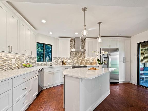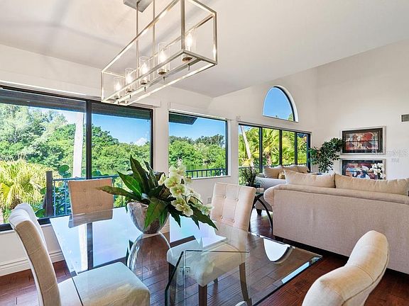 Live an elevated life with a birds' eye view of Heron Lagoon. Upon entering through the double door entrance, you will be captivated by your extensive private lagoon view. These 3 en-suite bedrooms, 2400+sq ft, two story home has breathtaking water views from every room. The glass walled LR/DR area with WBF along with a den, is a nature lovers' paradise as native flora & fauna integrate with your lifestyle. The stylish, brand new, light & bright stainless GE Profile appliance kitchen with wine cooler opens to an authentic tiki deck overlooking the lagoon & custom kayak launch dock. The main level master suite with wall to wall closets, updated bathroom & sauna access a deck with spa overlooking the lagoon, dock and lush landscaping. Upstairs are 2 additional sizable bedroom suites and a cozy sitting room with small deck that is perfect for family and or guests. An oversized 2 car garage features a chair lift making elevated living a breeze. This is Lagoon Living at its best on the quieter south end of Siesta Key. You will want to check out the magical side garden with orchids galore...
