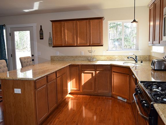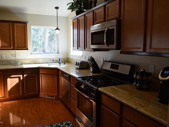 Located at the end of a cul-de-sac, this home offers a very quiet setting in a hectic world. The kitchen is the centerpiece of the home and has ample granite counter tops complete with a convenient breakfast bar. It also has a built-in desk making it the perfect place to sort and organize incoming mail.The open floor plan in the great room would make it a dream for entertaining and has corner fireplace rounding out the overall comfortable feel of this area. The master bedroom suite is the perfect place to retire after a day of Alaskan adventures and is highlighted by the tasteful granite topped vanity appointed with double sinks in the master bathroom. The oversized two car garage allows for plenty of parking and still provide space for storage shelves or a work bench. The backyard is heavily wooded and often has moose traveling through for your viewing enjoyment.