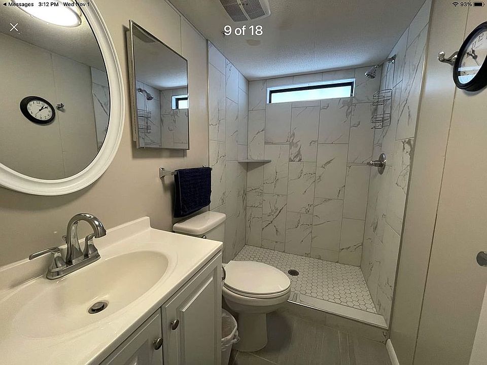 Remodeled home, has to new walk-in showers. Walk in closet. Washer and dryer included. New bathroom floors vanities. The roof and the AC unit are about a year old. New flooring throughout screened in covered deck. Parking on the side in a carport.