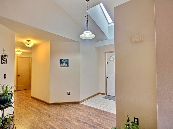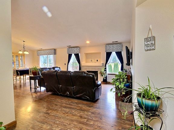 This great room concept Rambler has living room, dining room and kitchen that flow together for a fabulous space w/kitchen island, skylight and vaulted ceiling. Double door entry leads to your Master bedroom, ensuite bath and walk-in closet. Slider leads to deck with steps to your big fenced backyard. Oversized shed with power and loft is another great feature. New paint in and out, plus new furnace too! The views of the countryside, the dead end street and being part of a Golf Course community are just added bonuses!