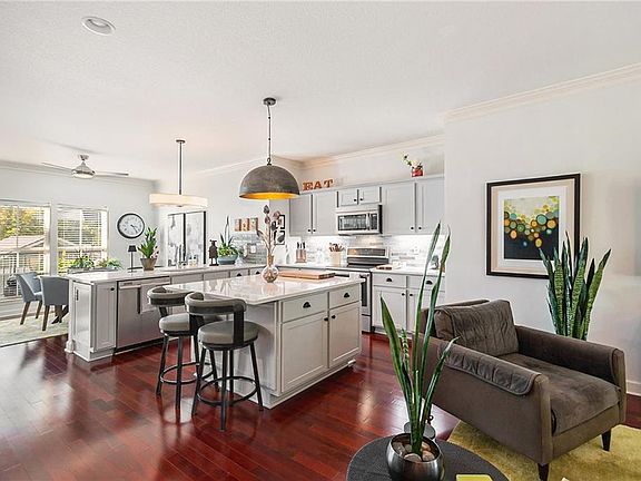 Charming and updated 2 story townhome in old Overland Park. Totally updated and meticulously maintained. Main level features an open floor plan with sparkling hardwoods, vaulted ceilings, and a spacious deck out back. Amazing kitchen features quartz countertops, island with additional seating, tons of counter and cabinet space, SS appliances, and great light fixtures. Kitchen opens to both the dining and living room areas. Main level feels light and bright! Upstairs you will find two bedroom suites. Primary has vaulted ceilings, ceiling fan, walk-in closet, shower, and double vanity. Laundry is located on second level. Finished lower level provides additional living space and a second half bathroom. Attached garage entrance is through the lower level. Nestled in a vibrant community, this town house is your gateway to a dynamic lifestyle. Unbeatable location! Close proximity to restaurants, shops, highway access, and trails. Maintenance provided including lawn and snow removed. LOW MONTHLY HOA. Do not miss this opportunity. Easy living at its finest.