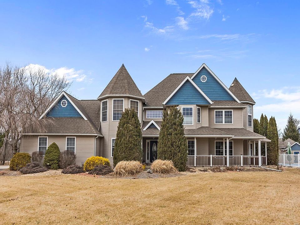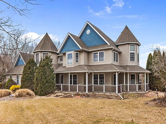 This one-of-a-kind custom-built Queen Anne Victorian 2-story home sits on 4.11 acres surrounded by over 150 established trees of all kinds and a stocked pond. The main house has 5 bedrooms, 4 full baths, 2 family rooms, living room, large kitchen, and breakfast room. The kitchen boasts Corian countertops, ceramic tile, and Amish cabinetry. A separate mother-in-law suite behind the home opens out to a 44,000-gallon in-ground fenced pool. This "second home" includes a full bath, living area, and separate bedroom. This building could also be used as a home office. The 3rd building on the property is a 3-car garage that includes a workshop, loft, and large reinforced tornado shelter.