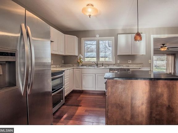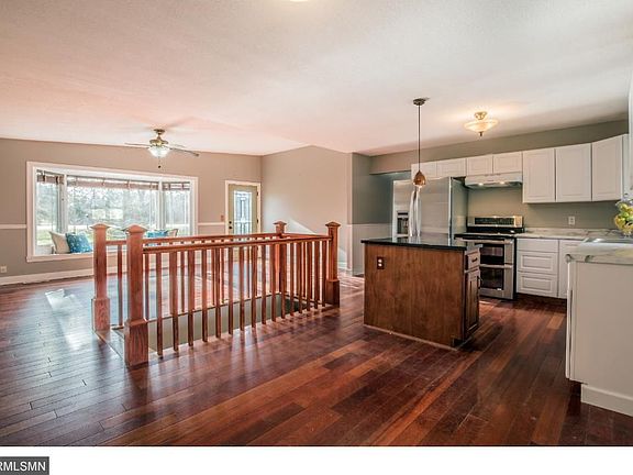 This home is located on private treed 1.3 acres lot! Partially fenced flat backyard ~ perfect for recreation, campfires, gardening and more! Newer siding, windows and doors throughout. Brand new kitchen cupboards and counter tops. Center island boasts elegant granite. Brazilian cherry flooring. Attractive upgraded tiled bath. Sunroom offers tranquil views. Open floor plan. Lower level waiting for your finishing touch.