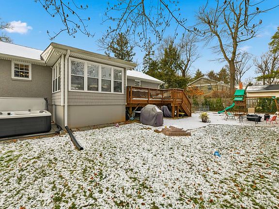 Back yard with hot tub, deck, firepit area and jungle gym