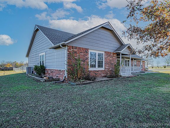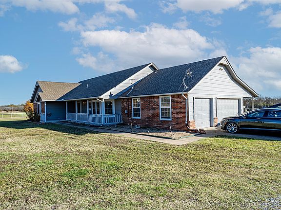Welcome to your dream homestead! A captivating 10-acre haven with lush pastures, creek and pond perfect for those seeking a serene rural lifestyle! This unique estate is ideal for equestrian enthusiasts and animal lovers, boasting cross fencing suitable for horses, cattle, and various animals. A charming 200 square foot shed is perfect for housing chickens, dogs, and other small animals. Horse enthusiasts will be thrilled with the spacious 2,400 square foot barn, which includes five horse stalls, a workshop, and full electric capabilities. The barn provides ample space for equine care and storage, making it a functional and integral part of the property. Step inside the well-maintained full brick home to discover three comfortable bedrooms and two stylish bathrooms. The living room features pergo wood floors and a double sided fireplace, creating a warm and inviting atmosphere, while the den area, adorned with sprawling windows, offers breathtaking views of the surrounding landscape. The kitchen is a chef's delight, complete with granite countertops and stainless steel appliances. The primary bathroom features double sinks, soaker tub, spacious shower and walk in closet. Relax on the covered front and back porches and enjoy the peaceful setting! The garage has a workshop for a craft room or office space. Located within the esteemed Collinsville school district, this property offers a blend of rural charm and modern conveniences. Located a few minutes from highway 75 with quick access to Tulsa only 20 minutes away! Whether you're bringing your animals and horses or looking for a peaceful retreat, this home is a true gem. Don't miss out on the opportunity to make this slice of serenity your home!
