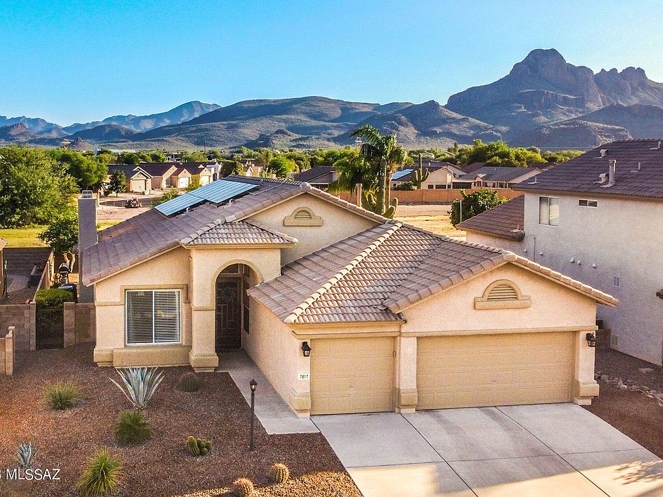 Welcome to this Charming Home with Breathtaking Views in the Heart of Continental Ranch. This beautifully remodeled 3-bedroom, 2-bathroom residence boasts 1,916 square feet of living space. This meticulously maintained home, constructed in 1998, is an idyllic blend of comfort and convenience. With an attached 3-car garage, it provides ample parking and storage options. Upon entering, you'll be greeted by a spacious layout, perfect for both living and entertaining. Natural light streams through a skylight, enhancing the warm and inviting atmosphere. The Owners Suite boasts a truly stunning and recently updated bathroom, designed to provide a spa-like experience. You'll relish in the modern amenities, floor to ceiling tile, herringbone pattern floor tile, and tasteful finishes. A generous walk-in closet offers ample storage space for your wardrobe and belongings, ensuring your comfort and convenience. The two secondary bedrooms are equally impressive, offering substantial living and closet space, making them perfect for family members or guests. The secondary bathroom has been tastefully remodeled, featuring beautiful beveled subway tile and the convenience of two sinks, ensuring that everyone has plenty of room to prepare for their day. Step outside to your private backyard and savor the stunning vistas of the Tucson Mountains. Enjoy the tranquility and privacy, as the rear of the property is protected by a wash, ensuring that no one will ever build immediately behind you. Nestled in the highly desirable Continental Ranch neighborhood, this property offers a serene retreat from the hustle of everyday life. Experience the peace of mind that comes with minimal vehicle traffic, creating a safe and family-friendly environment. The home is conveniently located near shopping, diners, schools, and many are within walking distance. For those seeking relaxation and recreation, a hot tub slab with a 220 V hookup is already installed, and you'll have access to not one, but two community pools, along with dog parks, skate parks, and ball parks. This home is also equipped with a large Solar System, boasting 14.8 KW DC / 11.4 KW AC, making it ready for an electric vehicle, hot tub, and even a swimming pool. The large system and current owner's low electrical consumption has resulted in a positive credit from TEP for all but one month this past year due to the home's energy efficiency. Don't miss this opportunity to own a piece of paradise in Continental Ranch. Schedule a viewing today and make this remarkable property your new home.