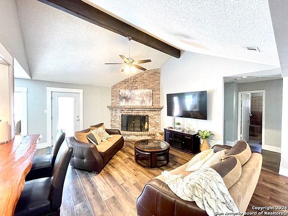 OPEN HOUSE SUNDAY, MARCH 17TH 2:00PM - 4:00PM | Charming one-story traditional home situated on a spacious lot offers stunning curb appeal! Complete with soaring vaulted ceilings and a wood burning fireplace that acts as the focal point to the living room, this home is a must see. Spacious living room seamlessly connects with the dining room creating a great space for hosting gatherings. Large windows throughout provide ample natural lighting for a clean, open feel. The kitchen features stainless steel appliances from the gas range, to the farm house sink and dishwasher. The bay window and custom bar top adds additional charm and seating just off the kitchen. Unwind in the primary bedroom which offers an expansive oversized walk-in closet and a lux en suite. The updated tile perfectly compliments the glass enclosed shower and double vanities. Two spacious secondary bedrooms and centrally located guest bathroom complete the interior of this home. With easy access to the backyard, you are able to seamlessly extend your indoor and outdoor living. Outside you will find an oversized patio that overlooks the vast backyard. The shed offers additional storage space for your tools and other equipment. With close proximity to numerous shops, dining establishments and some of San Antonio's noted attractions, you will get to enjoy the best of all the city has to offer. Schedule a showing today and be one step closer to making this your next dream home!