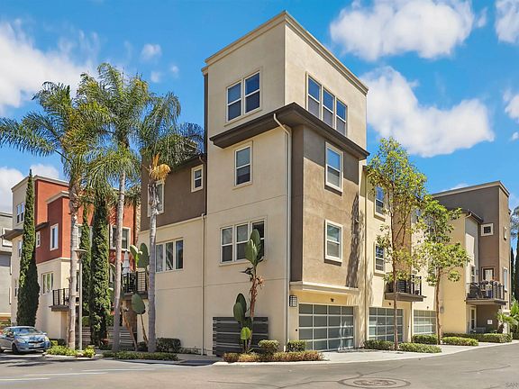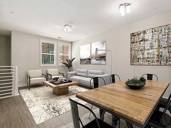 Welcome to contemporary living at its finest in this immaculate home in Civita. Boasting a stylish blend of tile and wood flooring throughout, this residence features an open floor plan that enhances the sense of spaciousness and flow. The heart of the home is the gourmet kitchen, complete with two pantries for ample storage and a convenient gas line on the balcony, perfect for summer BBQs with family and friends. Enjoy the elegance of shuttered windows that frame the living spaces and provide privacy when desired. Ideal for hosting guests or accommodating multigenerational living, the entry level includes a bedroom and bathroom, offering flexibility to suit your needs. Both bedrooms upstairs boast ensuite bathrooms, providing ultimate comfort and convenience. Additional highlights include a 2-car attached garage with overhead storage, a front load washer/dryer setup for added convenience, and the unparalleled amenities of Civita. Residents enjoy access to pools, spas, outdoor BBQ areas, and more, creating a resort-like lifestyle in the heart of Mission Valley. Perfectly situated for modern living, this home combines luxury, functionality, and community amenities, making it an exceptional choice. Experience the Civita lifestyle and discover your new home in this thriving urban oasis!