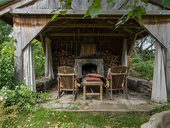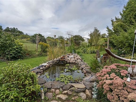 new large vanity in the first floor bath with a shower and separate jetted bathtub. Living room with pellet stove insert keeps the home toasty warm. Upstairs are four bedrooms with the master bedroom having a half bath off. And wait until you see the back yard! There is a small pond, a covered patio with a fireplace, paths and stonework throughout - the perfect oasis after a long day of work. Also included in sale is a large attached garage, a front enclosed porch and a separate storage shed.