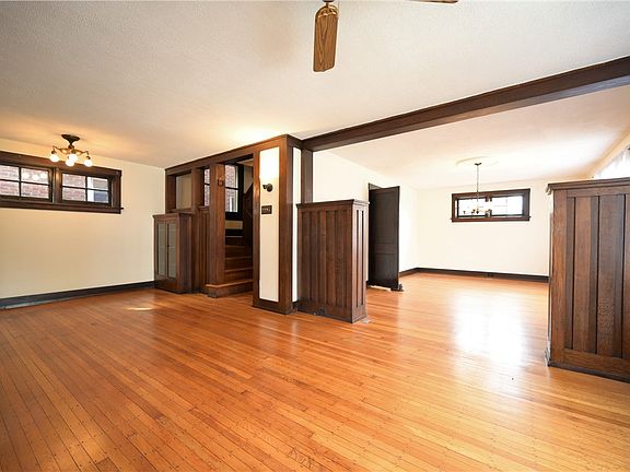 Wood, character and charm can be found throughout this spacious 4 bedroom home on a nice size corner lot. Cover front porch opens in to a large den with fireplace and many windows. Large living room and dining room features wood, windows and built-ins. Hardwood and pine floors can be found throughout the home. Nice size kitchen and cozy breakfast nook complete the 1st floor. Basement has a finished game room and full bath. You will also find a laundry room and several areas for storage. 2nd floor has 4 bedrooms and a second full bath. Off street parking and a wonderful landscaped yard. Must see!