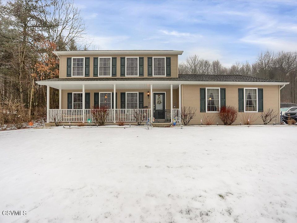 The home features a charming front porch with scenic views, ideal for relaxing. The interior boasts two living spaces on the first floor, a convenient half bath, and a second-floor laundry for added practicality. A partially finished basement with a full bathroom provides even more space for customization.