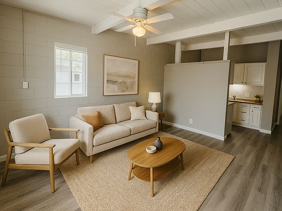This ground floor unit features laminate flooring and has been freshly painted in a cool San Francisco Fog hue. The kitchen is equipped with contemporary modern appliances with an appealing color scheme. The bathroom will be upgraded to tile backsplash (similar to the one that you see in the picture).