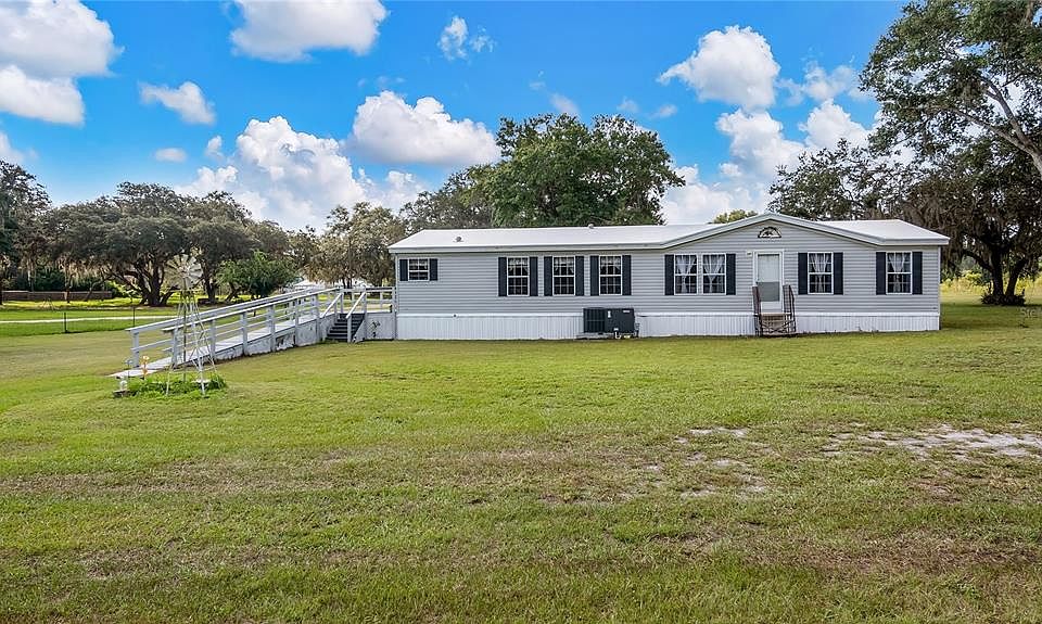 Gorgeous property with over 5 acres with beautiful Oak trees in Groveland! No HOA! Beautiful land with small pond for fishing too! There's a move in ready 3/2 double- wide manufactured home with paved road frontage! This home has nice split floor plan with laminate flooring through out except one bedroom has carpet. The Kitchen has been updated with plenty of space with nice island, stainless steel appliances and views of the backyard. The Master bedroom has a spacious walk in closet and the bathroom has dual sinks, updated cabinets with soft close drawers and a walk in shower. There's two more bedrooms on other side of home and a full size bathroom. There's a detached garage with work shop inside, well house that has room for extra storage and a chicken coop. Property has Duke Energy, Well water and Spectrum for Internet. Zoned Agriculture. Bring your horses, trailers and toys! Country living yet not far from town! Minutes to Publix, restaurants, Highway 50, Clermont, Hospitals and Turnpike.