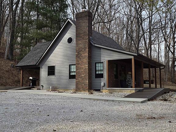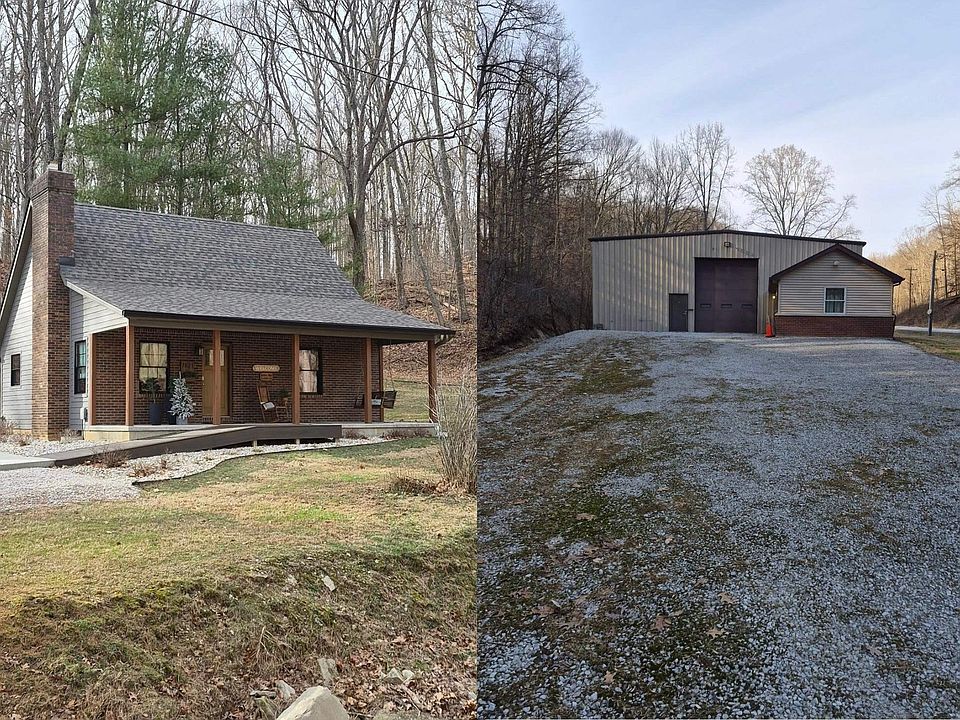 This beautifully finished property features a spacious two-bedroom layout complemented by an additional third sleeping area in the loft, equipped with a hide-a-bed for extra guests. The master bedroom suite is conveniently located on the main level, offering privacy and comfort. Enjoy the luxury of two full bathrooms with custom tiled showers and a half bath, while the main level laundry-utility area and abundant closet space add to everyday convenience. The kitchen and bathrooms have been updated with stylish cabinetry and quartz countertops, and all appliances are included. The home is being offered fully furnished, with window coverings already installed. Relax outdoors on the large covered front and back porches, perfect for taking in scenic views or grilling with friends. Inside, the living room boasts a cozy fireplace with gas logs, providing warmth and ambiance. A detached 2 1/2 car garage offers ample parking and storage. Additionally, a substantial 5,432-square-foot steel building at a separate location features 14- to 16-foot insulated ceilings and walls, oversized garage doors with driveways at both ends, and excellent lighting throughout. The building is equipped with three heat sources—LP, radiant, and a wood-burning stove—as well as an air conditioning unit, compressed air throughout, and plenty of space for various uses. Both sites are nestled among picturesque hills and woods,