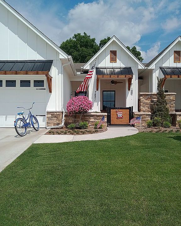 The Elm is a patio home plan - meaning it is intended to be connected through a shared wall to another unit which mirrors its layout. This 1726 square foot floor plan starts with a covered front porch, leading into a study on one side (or an optional bedroom) or a dining room and a mudroom, followed by laundry on the other. Continue to an open concept kitchen and family room, and then full hall bath and bedroom with walk-in closet to one side, and the master suite on the other with double sinks and larger walk-in closet. The large covered back patio adds a great outdoor space! Industrial grade sparkling expoxy garage floor, beamed ceiling in great room and kitchen, quality outside ceiling fans on front and back patios, decorative accent ceramics in baths, adorable front courtyard and charming landscaped back yard. Front and side yards maintained by HOA. Minutes to Warren theater, retail shopping, restaurants and 1 mile to Creek turnpike. Large 2 bedrooms with full baths, roomy laundry room with cabinets and counter. Low, low utility bills, energy efficient construction. Many more added upgrades . Shows better than new. Also 1 year home warranty and seller will help with buyers closing costs.