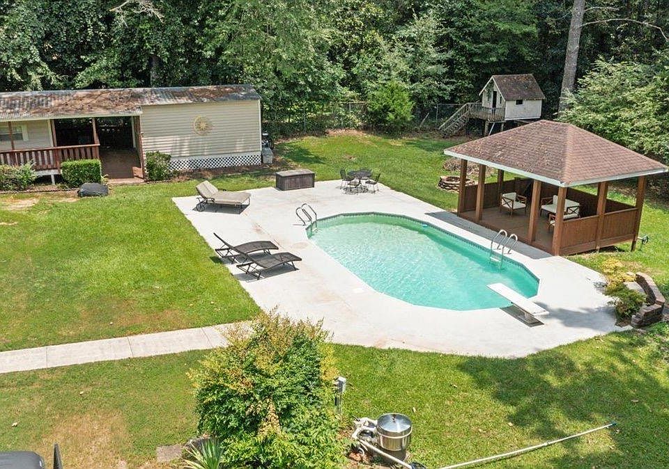 Stone fireplaceGas fireplaceFlat lotAttached one car garageOpen deckIn-ground poolFresh paint