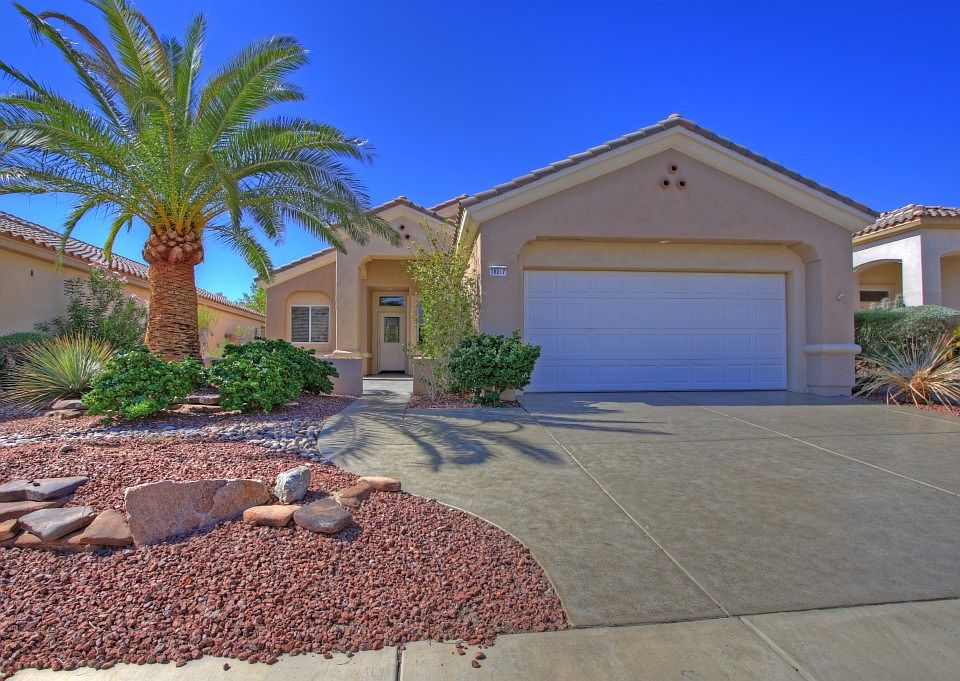 Lowest Priced Sun City Single Family home on a lush desert landscaped South facing lot with great curb appeal. There is a front courtyard to enjoy the mountain views and a large covered, private back patio. This Maui model has an extended dining room with a slider to the patio and 2BR/2BA. The second bedroom has a closet and isn't just a den.The home has just been fully painted inside and has all new carpets. The driveway has been professionally resurfaced which complements the lush professionally landscaped front. A new high efficiency Lennox AC was recently added. Located in beautiful Sun City Palm Desert, this 55+ community features three club houses, all with pools and exercise facilities, three restaurants, two gorgeous 18 hole golf courses, tennis, pickle ball and Bocce ball courts. There are over 50 social clubs for your enjoyment, a craft area, a coffee place and more in this beautiful & fun Del Webb Community. This home is ready to move into! Sold As Is. Do not hesitate!