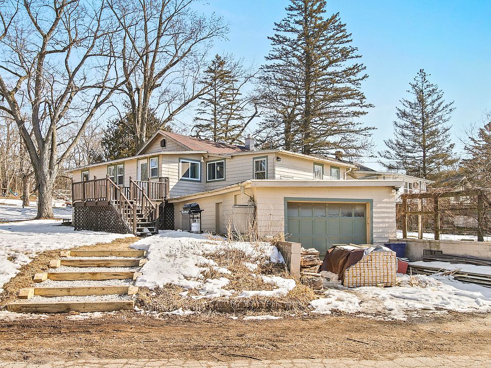This two bedroom one bath home, is nestled into a desirable neighborhood. Attached garage that leads into basement allows for convenient transition into home on these cold Wisconsin winters, and also creates ease of transporting wood to the wood burning stove to help cost-effectively warm the property. There is dual heating with the furnace which is also located in basement. Main level boasts open layout, bonus office/rec/storage landing area, oversized pantry, and mid century modern accents throughout. Why rent, when you can own? Situation on a corner lot, across from DNR land, and close to Lily Lake and other recreational activities, nothing is left to be desired. Check out the virtual tour and set up a time to check out this well maintained home.