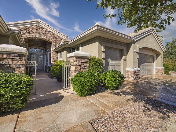 RARE. One of a Kind, South-facing Portofino extended model with TWO Main Bedroom Suites, one with Private Office. Huge lot of almost a 1/3 of an acre of lush mature landscaping including Navel Orange tree, five tangerine trees, Palms, Desert Willow, Sissoo, and Sierra Gold trees. Plenty of room for a pool/spa in any of three locations! Panoramic front yard and gorgeous entrance with custom concrete overlay, stacked stone, and beautiful beveled and cut glass French doors. Inside is just as beautiful with high tray ceilings, fresh custom paint and new recessed led lighting on dimmers. Open floor plan with 18' travertine tile throughout. Kitchen has stainless appliances, granite countertops, and upgraded cabinets. Living room and Family room both enjoy a double-sided fireplace. Outdoor patio has a built-in barbeque, Alumawood awning and is wired for TV. Extended garage has custom Crest cabinets and a wall-mounted cooler. Located near the LakeView Clubhouse. Buyer to pay a one-time replenishment fee of approximately $2300. Buyer to verify.