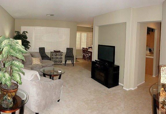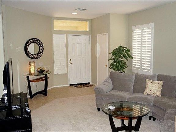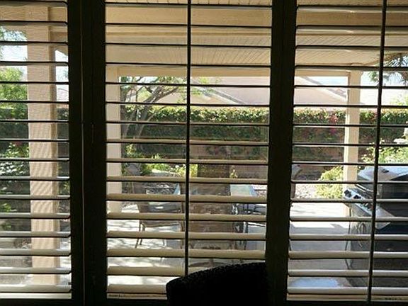 Sun City Palm Desert: With a South facing rear yard. This unfurnished beautiful 2 bedroom, 2 bath Barbados model is in move-in condition. Inside the home you will find an extended breakfast bar, a good sized dining area with some mountain views & a great room made for entertaining. It has upgraded lighting in the master and guest bedrooms, the master bath and dining area. The exterior has park-like desert friendly landscaping with trees, a citrus tree, extended Alumawood covered patio, a fountain, two side gates & an additional patio for sunning. It has plantation shutters throughout & sun screens for the kitchen, breakfast nook and master bedroom windows. All large appliances are included. It is centrally located within walking distance of the Sunset View Clubhouse where you will find the library, billiards, a dance studio, Boulevards Bar & Grill, the San Gregorio pro shop, bocce ball courts and an outside pool/spa. Please view the must see Virtual Tour.
