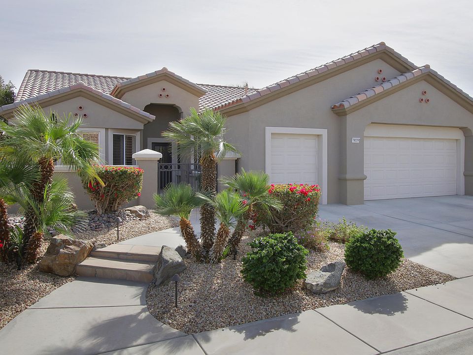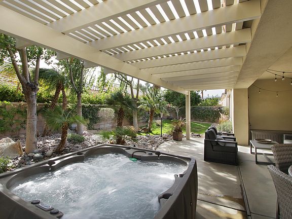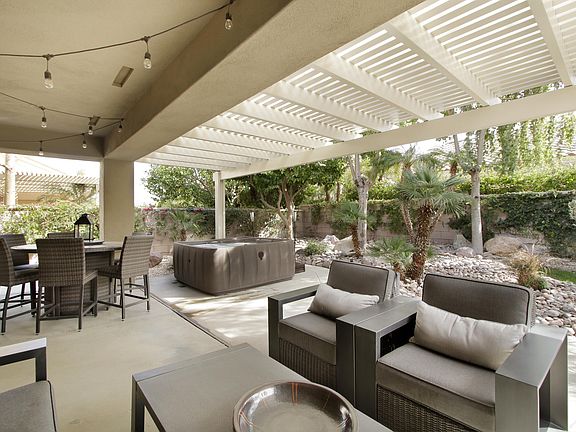 Totally refreshed, Sun City Palm Desert's most popular model, St. Croix is now on the market. This 2021 square foot 2 bedroom/ 2 bath plus den and hobby room beauty features must see updates. Totally remodeled kitchen with granite counter tops and track lighting. Fixtures in both baths have been replaced including faucets, lighting and shower doors. Freshly painted inside and out, this home features low maintenance landscaping and decorative lighting that complements the brand new alumawood patio cover. A one year old above ground gas fired spa is included in the sale at no value. The two car and golf cart garage is air conditioned for car and driver comfort. Sun City Palm Desert amenities include two Billy Casper 18 hole golf courses, a putting course, three club houses and exercise facilities, restaurants, tennis, pickle and bocce ball courts and over 80 social clubs. If you get bored here it's your own fault. NOTE: Buyer to pay one-time Reserve Replentishment Assesment equal to six months HOA dues. May be paid over nine months.