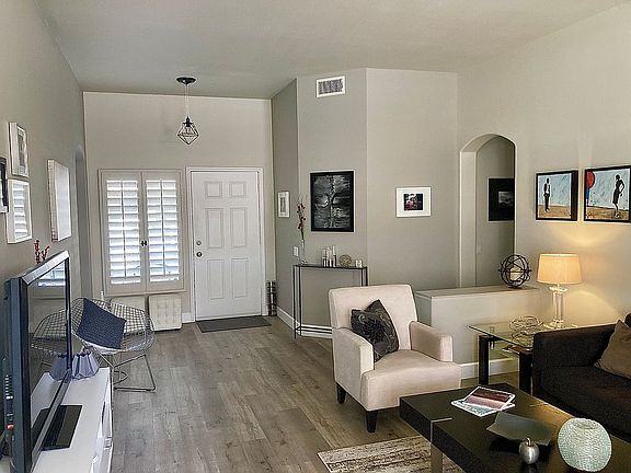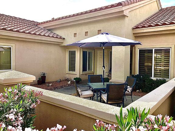 Be on vacation everyday. This Sun City Palm Desert (55+) resort home is maintenance free. The HOA takes care of the landscaping, irrigation, stucco, paint, roof and you own the land. Updated with new: luxury flooring, stainless steel appliance, granite counters, lighting, paint, ceiling fans and hardware. Enjoy your morning coffee in the breakfast room or formal meals in the dining room. A pantry provides plenty of storage in the kitchen. Transom windows throughout, beautiful bay window in the main bedroom along with a walk in closet and ensuite with double sinks. This home also has a convenient interior laundry room. The development has all the luxuries of living at a resort with pools, golf, tennis, gyms, pickleball, bocce, restaurants, lakes, parks, dog parks and coffee shop, also included in your low HOA’s is Spectrum internet and cable with HBO & Showtime for relaxing at home. Some furnishings included.