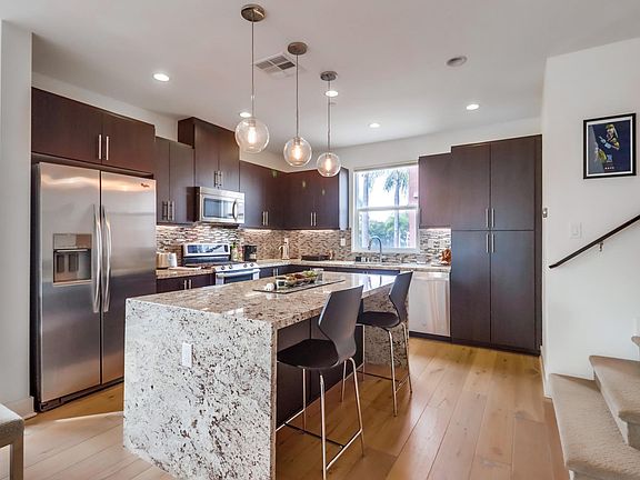 Unique opportunity to rent a fully furnished home in the award-winning Origen neighborhood of Civita. No expense spared with the details in this home and in pristine condition. Upgrades include custom built-in bar; high-end light fans, fixtures and LED recessed lighting; custom stone, marble and wood accents throughout; Hansgrohe faucets and fixtures including rain showerhead in primary suite; gourmet kitchen with abundant storage space, stainless appliances and glass/steel custom backsplash; Provenza oak wood floors on stairs and main living level; LG front-loading washer and dryer in private laundry closet and surround sound system in the living room. This home enjoys a courtyard, corner location and is an steps to the Origen private pool and hot tub. In addition, the Civita community offers a 14 acre city park with play area, gardens, basketball courts, amphitheater and plenty of open space as well as several additional pocket parks. The recreation center includes 2 pools, hot tubs, 2-story state-of-art gym, game room, onsite management, BBQ areas, fire pits and an amazing social party room for private and community events. Mission Valley is central to all San Diego offers including upscale shopping, grocery stores, restaurants, beaches, trolley, freeway access, parks and downtown. Tenants responsible for all utilities. No pets allowed, furnished only, long term lease, owner pays HOA dues for amenities & tenant pays all utilities including electric, gas, trash, water, cable & internet.