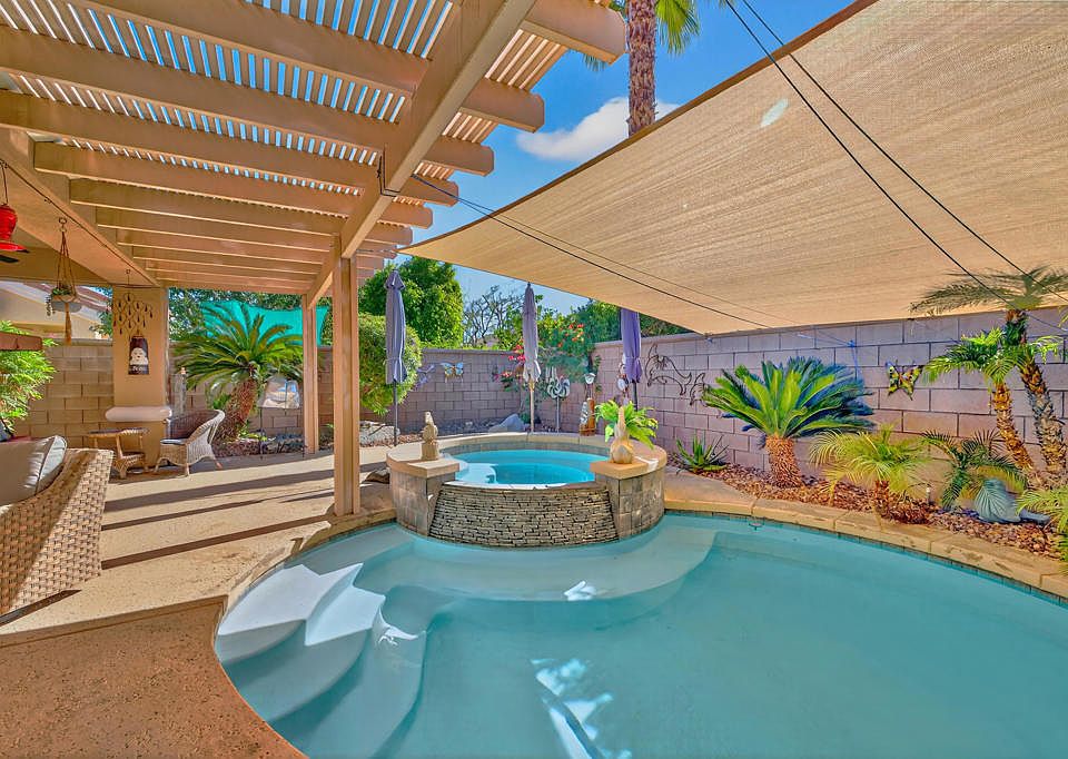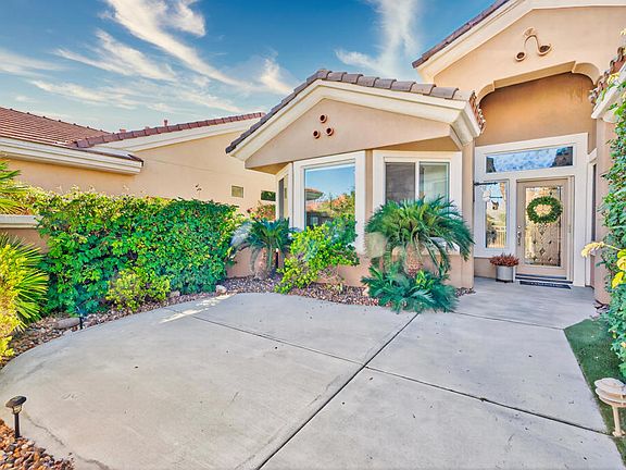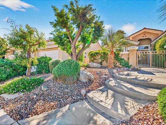 Wonderful St. Croix in Sun City Palm Desert. So many upgrades they are listed in Documents. Refreshing Pool & Spa with Shade Cover in backyard next to covered Patio with Misters. Double doors lead to Library; pocket door to Office. Upgraded maple cabinetry in Kitchen & Baths. Primary bedroom has the Bay Window plus French Door to backyard. Primary bath as a jetted tub plus a separate shower. Laundry Room includes a convenient sink. Extended Garage in both length & height. Solar System is leased & assumable (see Documents). Upgraded baseboards. Sun City Palm Desert was Del Webb's ''Jewel in the Crown'' & no wonder what with 2 Golf Courses, 3 Clubhouses, each with pool & spa, indoor Walking Track, huge Ballroom & Billiard Room, Tennis Courts, Putting Course, Pickle Ball Courts, Card Rooms/Game Rooms, Craft Rooms, Activities galore. A Golf Cart is included with sale. Assumable VA loan.