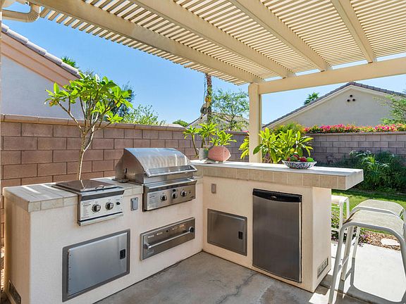 Sun City Palm Desert- The '' Montego '' plan with 2 bedrooms and a den or easily make it a 3 bedroom in a great location near Lakeview Clubhouse! Quiet south facing patio location with no wind or sand. Wonderful curb appeal with mature trees and grass entry. BOTH AC AND WATER HEATER HAVE BEEN REPLACED!ALSO AN OUTDOOR KITCHEN! Great room floor plan with primary bedroom on one side and other bedrooms on the opposite side The primary bedroom has a view of the rear patio with a door leading to the outside. The primary bath has two sinks with new hardware, new vanity lighting and a stall shower. The secondary bath has new hardware and a tub/shower combination.The kitchen has a spacious breakfast room area with a view towards the front entry. This home has been beautifully maintained and it shows it. Kitchen includes lovely wood stained cabinets including a large pantry with pull out drawers, above the cabinet lighting and pristine corian! The great room has a large slider leading to a fabulous back patio! Yoi are in for a treat viewing this back yard! Total privacy with no views of neighbors windows! AND a 'peek a boo view' of the mountains!. It includes an island with BBQ, side burner, warming drawer and a mini refrigerator! Super convenient for enjoying the south facing sunshine and a great place for entertaining with a built in seating area! .All beneath a lovely latticed alumawood patio cover. The back patio is very private with colorful bushes, flowers. and fragrant plumeria trees. There is even an outside shower, if you get too warm sitting in the sun!