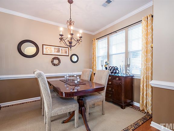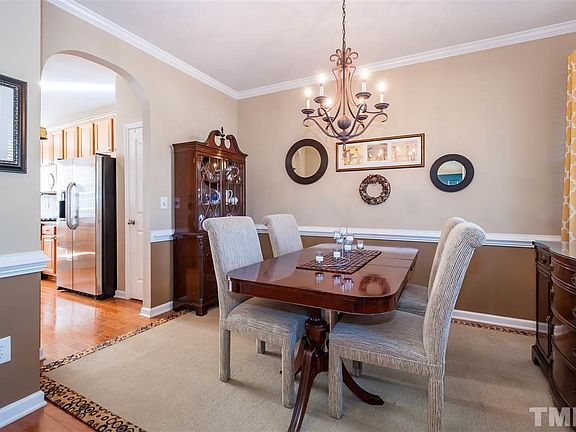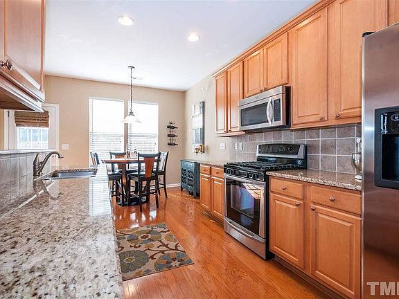 Lovely well maintained 3 bedroom home. Gleaming hdwds on main flr, formal dining, great kitchen offers granite counters, tile back splash, SS appl's & breakfast area w/access to the fenced backyard & patio. Large living rm features a 2 story ceiling, gas log frpl & wall of windows for plenty of natural light. Spacious master has cathedral ceiling and private bath w/dual comfort height vanity, garden tub & sep shower. Relax at the comm pool. Convenient to schools, shopping, dining, I-540 & RTP