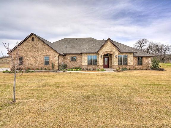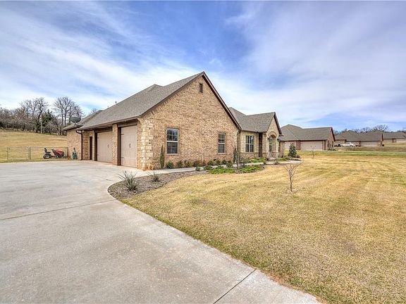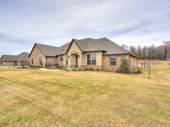 Enjoy your success in this custom built home located in the sought after Deerfield West addition. This fully fenced 2,342 sqft, 3 bedroom, 2.5 bath is built on just over 1-acre of land gives you the space your family needs. Designed with luxury in mind this home has an entertainers kitchen complete with granite counters, custom wood cabinets, gas range, and a storm shelter. Upgrades to this ranch beauty include: sound system, landscaping, and plantation shutters throughout. Step out on the back patio to take in the view and enjoy the peaceful scenery.Easy access to I-40, near Tinker AFB, and no HOA.