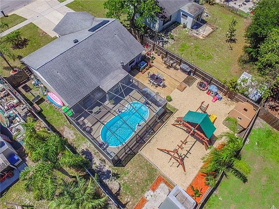 BEAUTIFUL 3-BED ; 2-BATH ; SPLIT FLOOR PLAN ; POOL HOME WITH FENCED-IN BACK YARD! Don't let this opportunity slip away! This home is located in the Trinity area and walking distance from Seven Springs Elementary. Kitchen boasts stainless steel appliances, Breakfast bar, and built-in desk. Living/Dining room combo provides an open floor plan with great views of the pool. Inside utility room provides extra pantry space and a side door entrance. Paradise waits for you in the back yard! This screened-In pool and outside deck are perfect for entertaining or spending quality time with family. Over-sized back yard is completely fenced in and includes two storage sheds and an upscale play ground. Additional features of this home include Plantation shutter, Crown Molding, Solar hot water heater, and newer fans/lights. Schedule your showing today!
