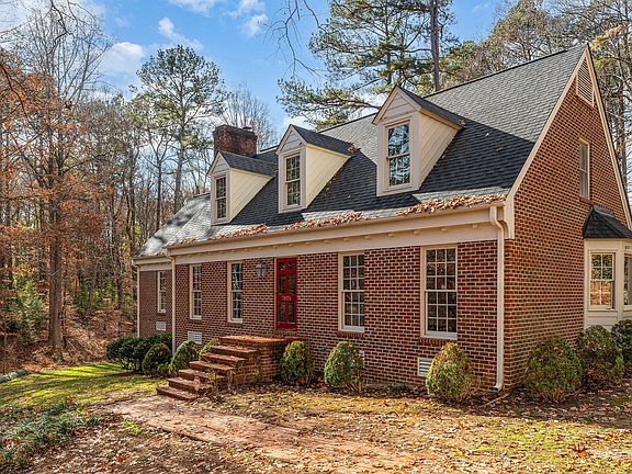 Incredible all brick Williamsburg style home on a breathtaking 2+ acre lot in Dutchman Downs! This well-established neighborhood is on the border of Cary and Raleigh, with no city taxes. Gorgeous heart pine floors throughout the first and second floors. First floor primary bedroom with his and hers closets. Inviting family room with huge brick fireplace, wood beams on ceiling and access to the covered porch. Formal dining room for entertaining. Functional kitchen is open to the delightful breakfast area with bay window that lets the outside in. Relax on the screened in porch with swing. The basement is an added bonus - 627 sq ft finished but unpermitted flex room with a fireplace and full bath, along with an unfinished workshop/storage area with woodstove ,built in work bench and double doors to outside. If your dream is to live in a country setting in the middle of everything, this is the perfect house!