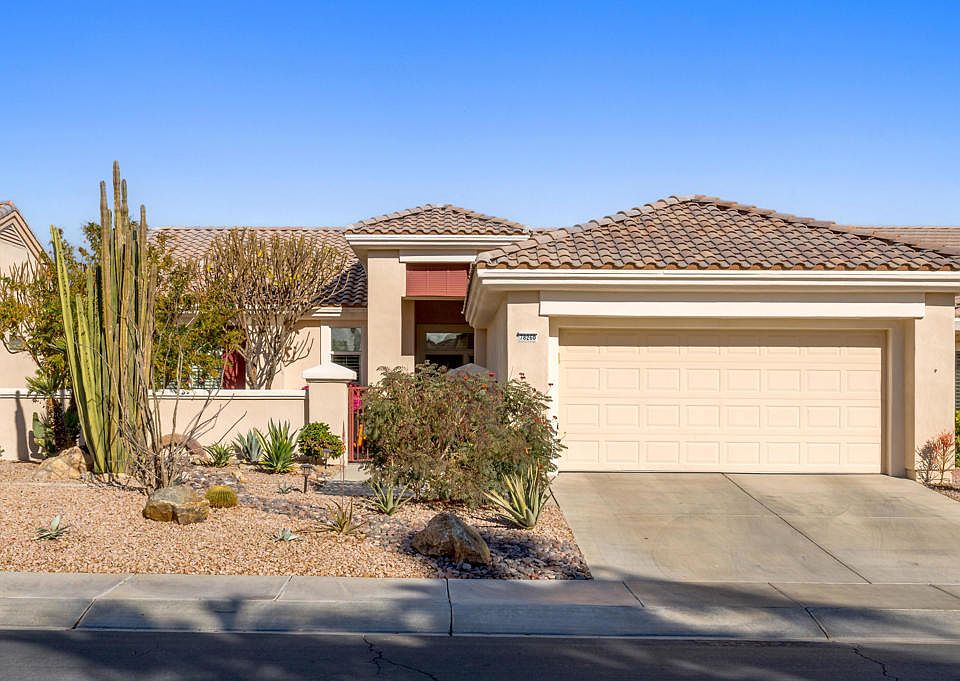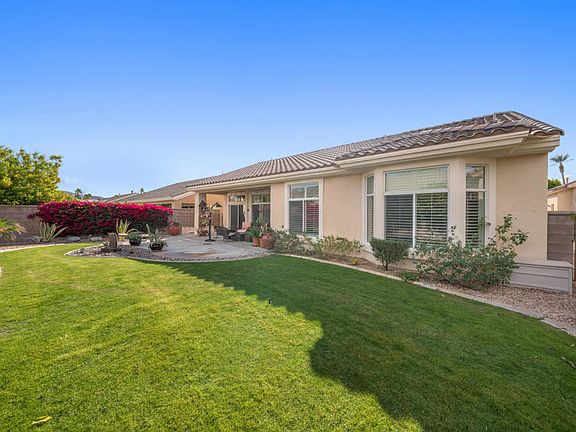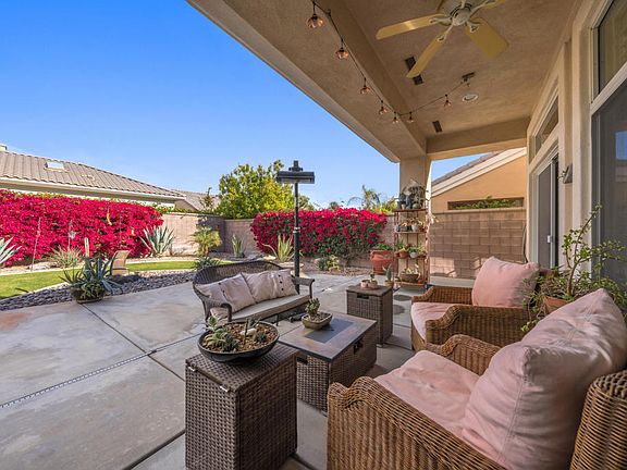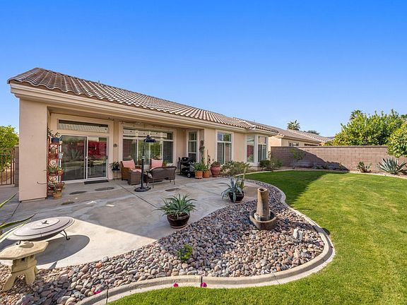 Sun City Palm Desert- Morocco. Located a short distance to the Lakeview Fitness Center & Pool, this popular greatroom home has a beautiful north facing rear yard w/a spacious patio and curbed planters appointed with a variety of desert plants such as agave, cactus & citrus. A gated south facing front courtyard w/patio provides function & curb appeal. The home is meticulously maintained inside and out & offered turnkey-furnished, outside of escrow. Inside, 10ft ceilings and transom windows provide a light & open environment. Diagonally laid tile is in all but the bedrooms. Upgraded baseboards, fans, light fixtures & hardware are throughout. The kitchen has stainless appliances (incl a beverage fridge), cabinets w/pull-out shelves, pendant lighting, and a decorative tile backsplash that is also utilized in the customer island w/quartz counter & breakfast bar. The den has custom built-in shelving & desk. Double doors open to primary suit w/a bay window & large walk-in closet w/custom built-in storage. The primary suite bathroom has dual sinks, a stall, shower w/glass enclosure, refinished cabinetry, upgraded lighting, mirrors and fixtures. The guest bedroom has hardwood flooring. The guest bathroom has a large tub/shower with custom tile surround, a vanity with refinished, cabinetry, quartz counter, upgraded mirror, lighting, and fixtures & sink. The laundry room has built-in storage. The extended 2 car garage has a nook for golf cart parking and built-in storage. AC new 2015.