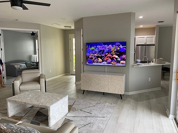 The property has been COMPLETELY remodeled with all upgrades & includes brand new appliances and new contemporary furnishings, and a beautiful 25X10' lanai, facing the lake. ALL 5 SLIDERS/WINDOWS, on west side, have a view of the lake w sunsets.Kitchen/bathrooms/laundry room have white/grey vein quartz countertops, new white cabinetry. Master bedroom has a brand new top of the line, king size power adjustable, tempurpedic mattress, 2nd bedroom-queen memory foam, 3rd bedroom-twin trundle daybeds, 2 new state of the art tv's, 55" master bedroom, 65"Sony OLED tv living room, 2 full bathrooms, 2-car garage, laundry room w sink and new washer/dryer. Large closets and pantry. Beautifully landscaped w/common swimming pool and clubhouse 2 condos away. This property is a seasonal rental January through May (available other months as well minimum of one month). Owner pays water, garbage, landscaping and association fees. Renter pays utilities/electric. No smoking or pets. Rente tot follow HOA rules.