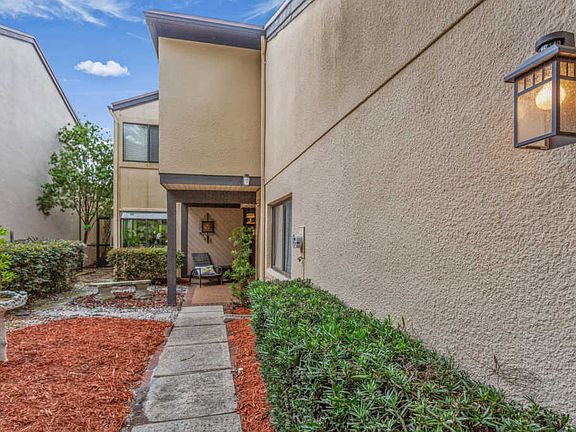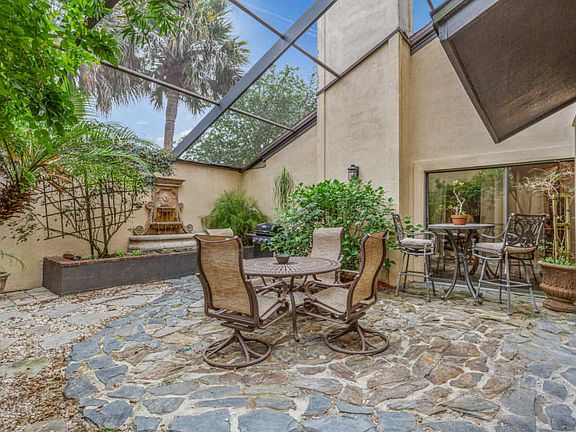 Location Location! If you are uninterested in the cookie cutter homes then this charming Single-family detached home is for YOU! Upgraded and renovated contemporary 3/3 with rear private and landscaped 2 story screened patio and large fountain. Sliding glass doors from kitchen and great room lead to this outdoor living space. Large open great room with a 2 story vaulted ceiling and designer fan. Kitchen cabinets upgraded and new countertops. Home has all the extras including new carpet upstairs, wet bar, skylights, and fireplace. Master and second bedroom upstairs each have attached full bath. Large renovated master bath with large shower, whirlpool spa tub and double vanity. 3rd bedroom downstairs being used as a spacious office with built in work station and large closet.