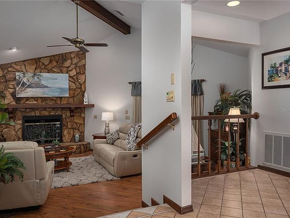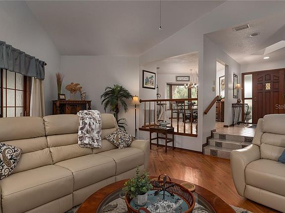 What a beauty this one is... tucked away in the peaceful neighborhood of River Country Estates, set back off the road with it's winding driveway, covered by a canopy of tall oak, maple and palm trees. Upon entering the home you will be greeted with a large sunken living room with cathedral ceilings and a wood-burning fireplace. The formal dining area features a bay window and overlooks the living room. The large kitchen features a dinette area and a desk area, oak cabinets and Corian solid countertops. Down the hall you'll find three large bedrooms. The owner's suite features a walk-in closet and ensuite bathroom with built-in vanity and standing shower. The home features Pella windows and doors throughout. The backyard is a beautifully landscaped oasis! Entertain guests on your pavered patio next to the little pond or to escape the sun you can retreat to the fully enclosed screened lanai! Any which way you look at it, this home is a dream! Schedule your tour today and be sure to view our virtual tour too!