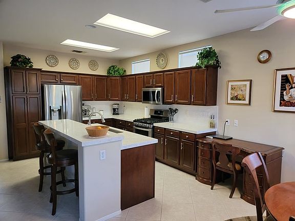 ATTENTION!! This highly UPGRADED Cayman model is beautiful and pristine. Inside 2Bd, 2Ba plus Den/Office with privacy double door entry. The kitchen featuring refinished cabinets, gorgeous slab quartz counters, stainless steel appliances with a breakfast bar is open to the living room and dining area. Both bathrooms have quartz counters. The master bath cabinets are newly refinished and shower is enclosed with seamless glass. Plantation shutters in every room and17'' diagonally laid floor tiles are an off white neutral color. The large backyard has been professionally landscaped and features a beautiful interlocking brick patio, with gas firepit and built-in seating, perfect for entertaining or relaxing outside. Two car garage has tons of storage with built in cabinets.Great cul-de-sac street close to Sunset View Clubhouse, pool, Boulevards Restaurant, billiard room, bocce courts, library and multiple meeting rooms . Offers to be subject to the sellers successful close of escrow on replacement property.Furniture may be available outside of escrow