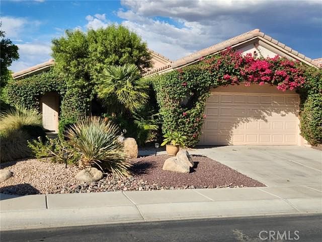 Welcome home to this Sun City Palm Desert gem! Wonderful single story home centrally located in the heart of the development on a great cul-de-sac located near the Sunset view clubhouse. The stunning Bougainvillea makes for incredible curb appeal. Featuring an airy open floor plan, the kitchen has plenty of cabinet space and you'll also find a dining area with a wonderful large bay window allowing for incredible natural light. The large primary bedroom has a spacious walk in closet and large bathroom with a sitting vanity and glass shower. The back yard is very private with beautiful raised planters and tasteful desert landscaping with a convenient covered patio complete with sitting area for those beautiful desert evenings. Don't miss out on this one!