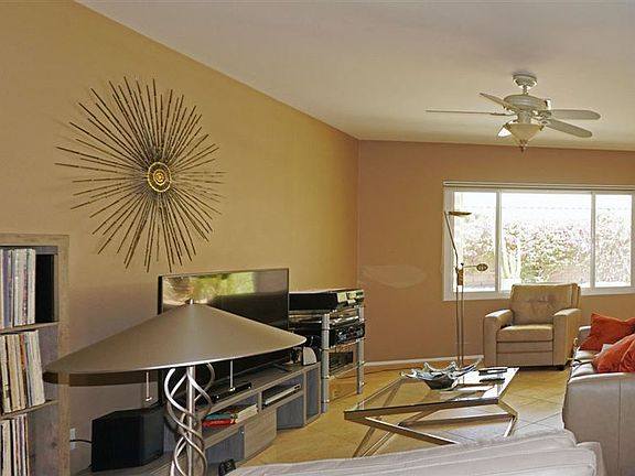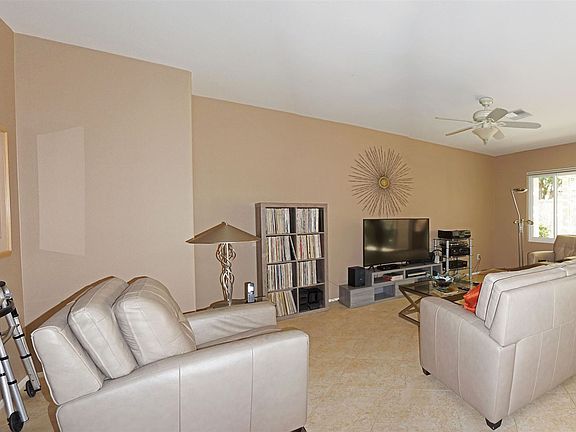 Sun City Palm Desert - Cayman. This rare 3 Bedroom, 3 Bathroom Cayman is ideally located between the Sunset View and Lakeview clubhouses. The north facing rear yard has an extended patio, alumawood patio cover & low maintenance desert landscaping. Upgraded Milgard windows are throughout. The interior is warm and welcoming. Diagonally laid tile flooring is in all but the bedrooms. The kitchen has slab granite counters & breakfast bar. A bay slider leads from the dinette to the patio. The guest on-suite is on the opposite side of the house from the master suite. The master bath has dual sinks & a stall shower w/textured glass doors. The laundry room has built-in storage. The extended 2 car garage has abundant built-in storage.