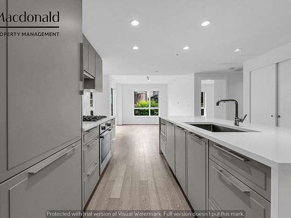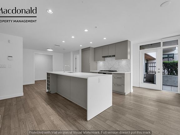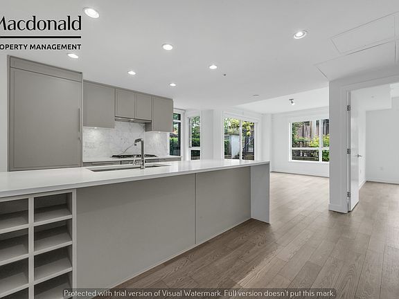 Luxurious and spacious garden-level apartment at the LEVESON, on Granville & West 62nd, in Marpole. The 1,360sf living space comes with two underground parking sports and an extra huge L-shaped private backyard as a bonus. This unit offers many high-end features, including SPA-like bathrooms, engineered hardwood floors, a central air conditioning (A/C), gourmet kitchen with gas range, Caesar stone waterfall counter tops and premium integrated Bosch appliances. The master bedroom has a 5-piece en-suite bathroom & walk-in closet with access to the backyard. This spacious, quiet suite is East facing (away from Granville Street) and offers an open concept layout, with floor to ceiling windows and an abundance of natural light. Large kitchen with an oversize island, quartz counter top and integrated Bosch appliances.