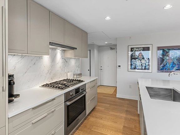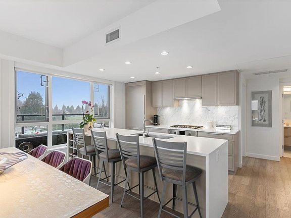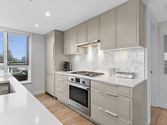 Enjoy beautiful sunsets from your expansive top floor terrace, & all the comforts of your PENTHOUSE corner unit with 2 bedrooms/2 bathrooms, plus spacious den. Contemporary design & quality finishes are found throughout the home, with a stunning kitchen with large island, Caesarstone quartz waterfall countertops, marble backsplash & premium integrated Bosch appliances. The open living plan is perfect for entertaining & features beautiful hardwood floors & large windows to enjoy the views. The primary bedroom features a gorgeous ensuite with double sinks & large shower. Other benefits include A/C, gas hookup for BBQ, parking stall & storage. Great location gives you easy access to all you need, while being only minutes away from Downtown, YVR, UBC & more. Nothing compares - check this out!