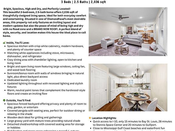 Welcome to 7829 Alawai Avenue in Diamondhead, MS — a bright and spacious home that's move in ready and designed for both comfort and lifestyle. With 3 bedrooms, 2.5 baths, and over 2,000 square feet of thoughtfully designed space, this home offers an open floor plan filled with natural light, updated finishes, and warm tones throughout. The kitchen features crisp white cabinetry and plenty of counter space, flowing into a cozy dining area and inviting living room, while the sunroom adds extra space to relax or entertain with a view of the backyard.