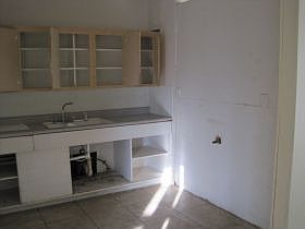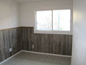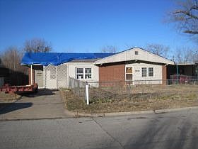 Partial brick and siding with a converted garage and a blue tarp on the roof. Lots of potential and several extra rooms.